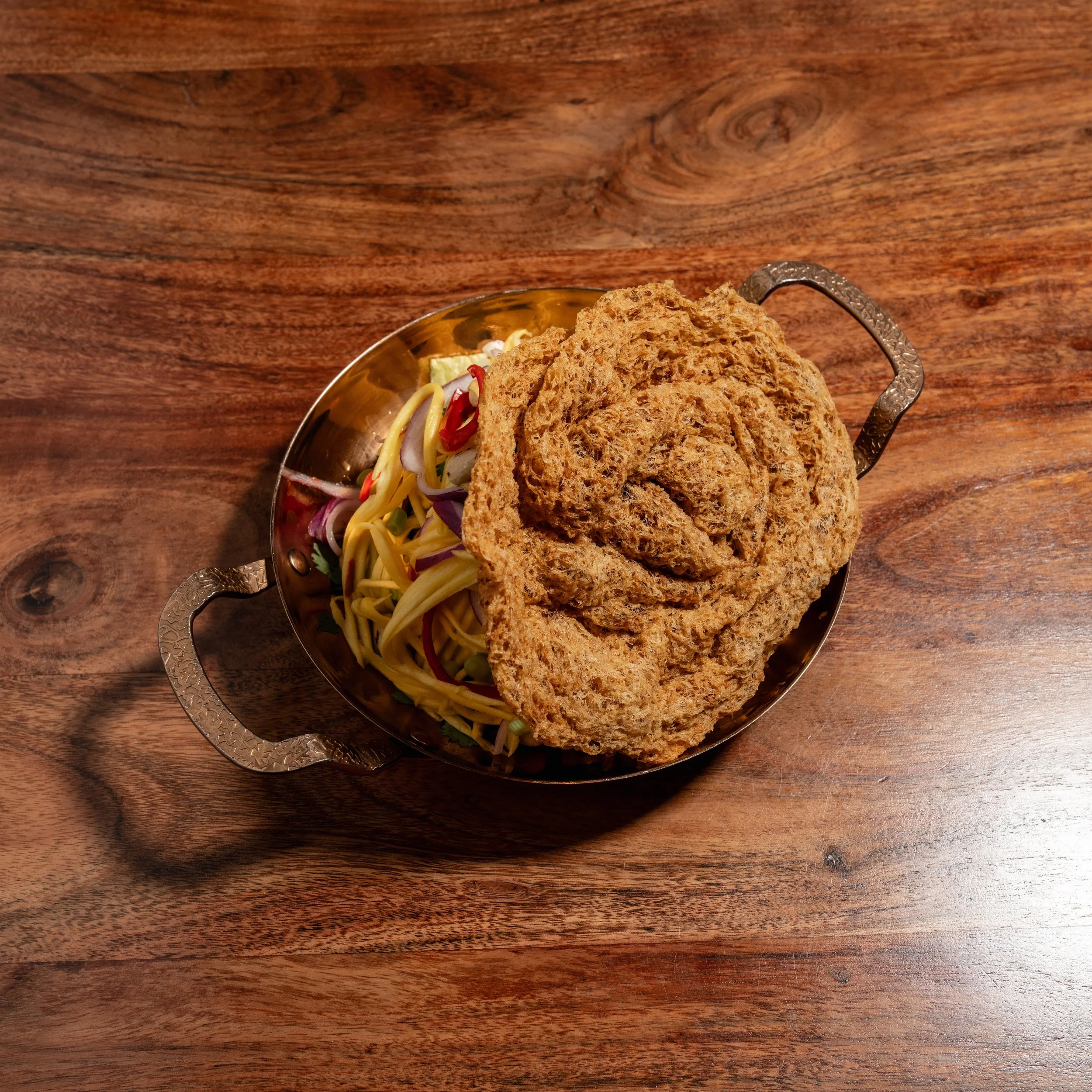 Crispy fried catfish flakes topped with fresh green mango salad, chili, lime, and herbs. A Thai signature dish that’s light, crunchy, and bursting with flavor.